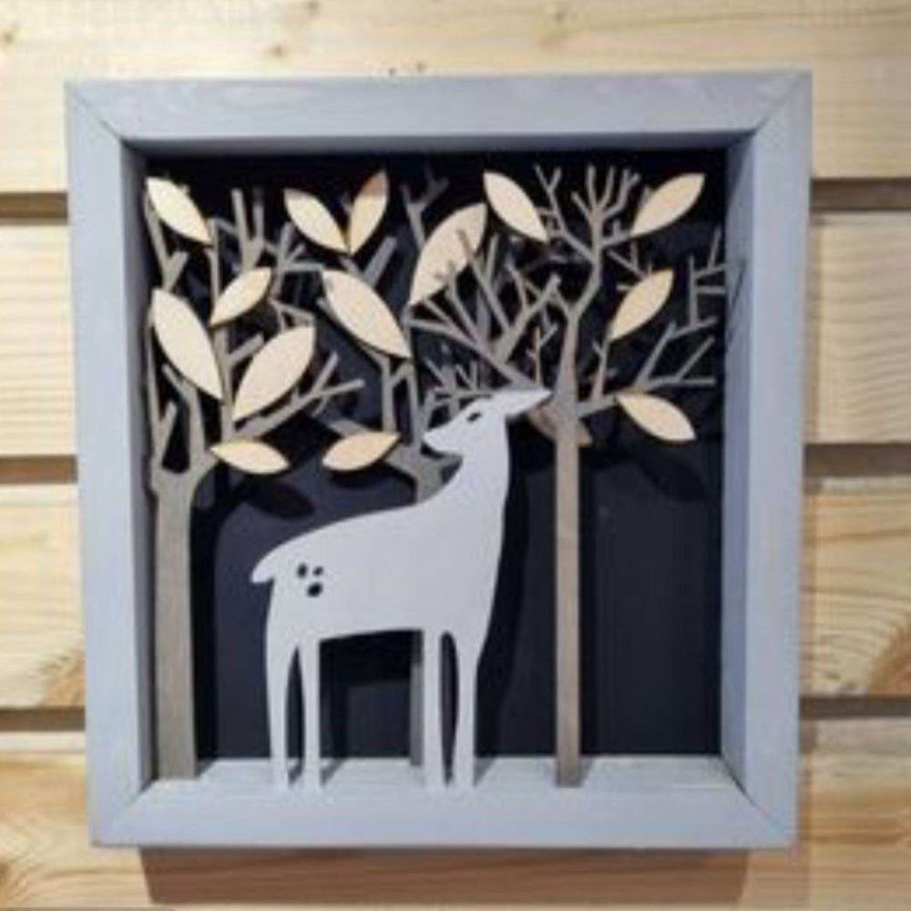 "تابلو چوب دست ساز آهوی سفید و جنگل پاییزی"